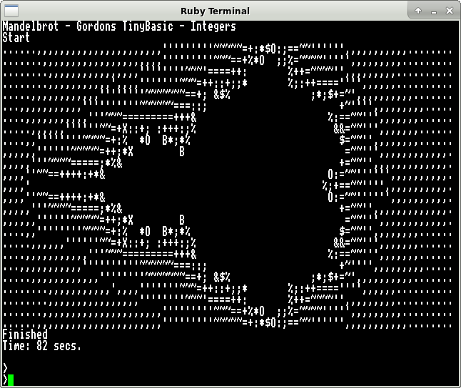 There are a few demo programs for it including my new Mandelbrot implementation, but be aware – Tiny Basics are not known for their speed. They do not tokenise the input like MS and newer Basics so there is a lot of string compares going on for every line of code executed.