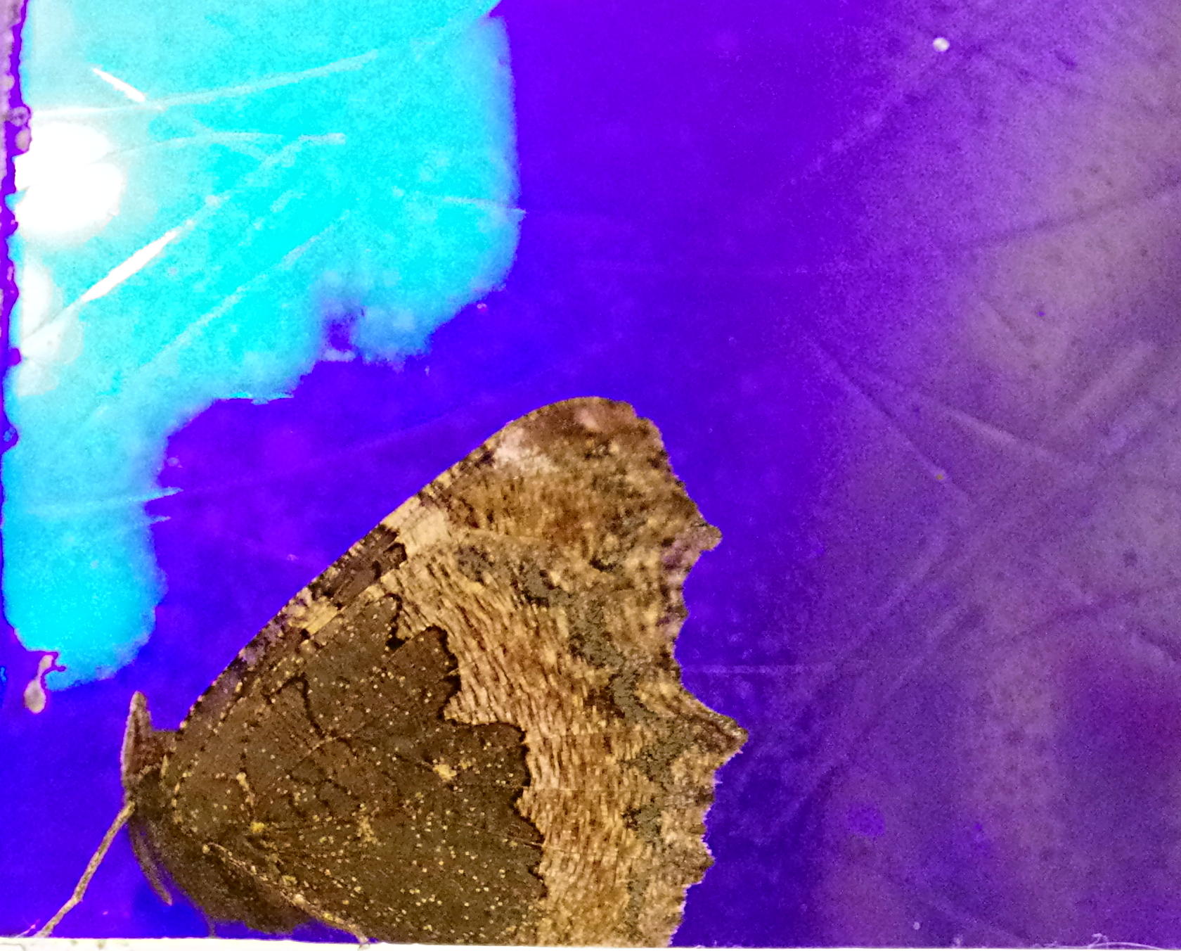 Butterfly on the windowThis butterfly (pretty sure it’s a Red Admiral, but the underside doesn’t quite match those I’ve seen online) has obviousy woken up a bit early and was fluttering around earlier. Don’t think it’s that warm today… It’s perched on a window frame that has blue stained glass in it.