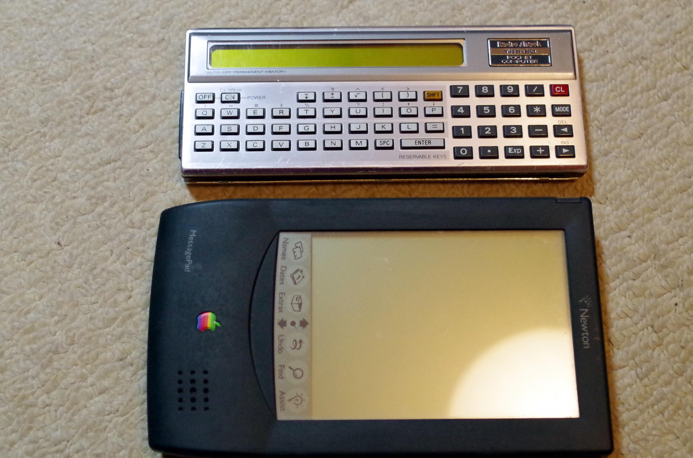 So the top one is a TRS-80 Pocket Computer (made by Sharp, c1980). It has some 1500 bytes of RAM and is programmed in BASIC. The bottom is an original Apple Newton MP100.. Arguably the forerunner to modern tablets and smartphones. If only it actually delivered what it promised…