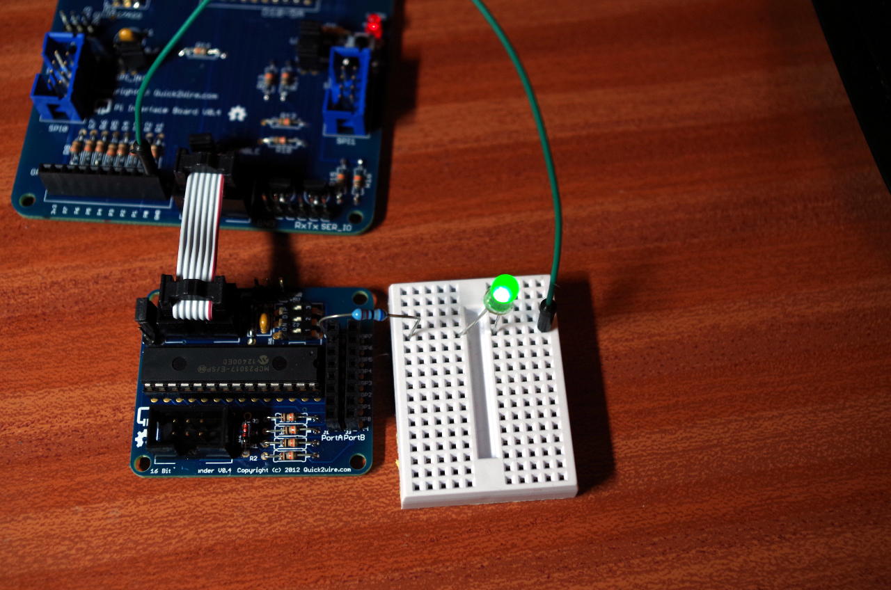 Using the board is very easy – the 8 GPIO pins are numbered 0 to 7 and use the same pin numbering scheme as wiringPi (And as I understand it, Quick2Wires own Python libraries use this numbering scheme too)