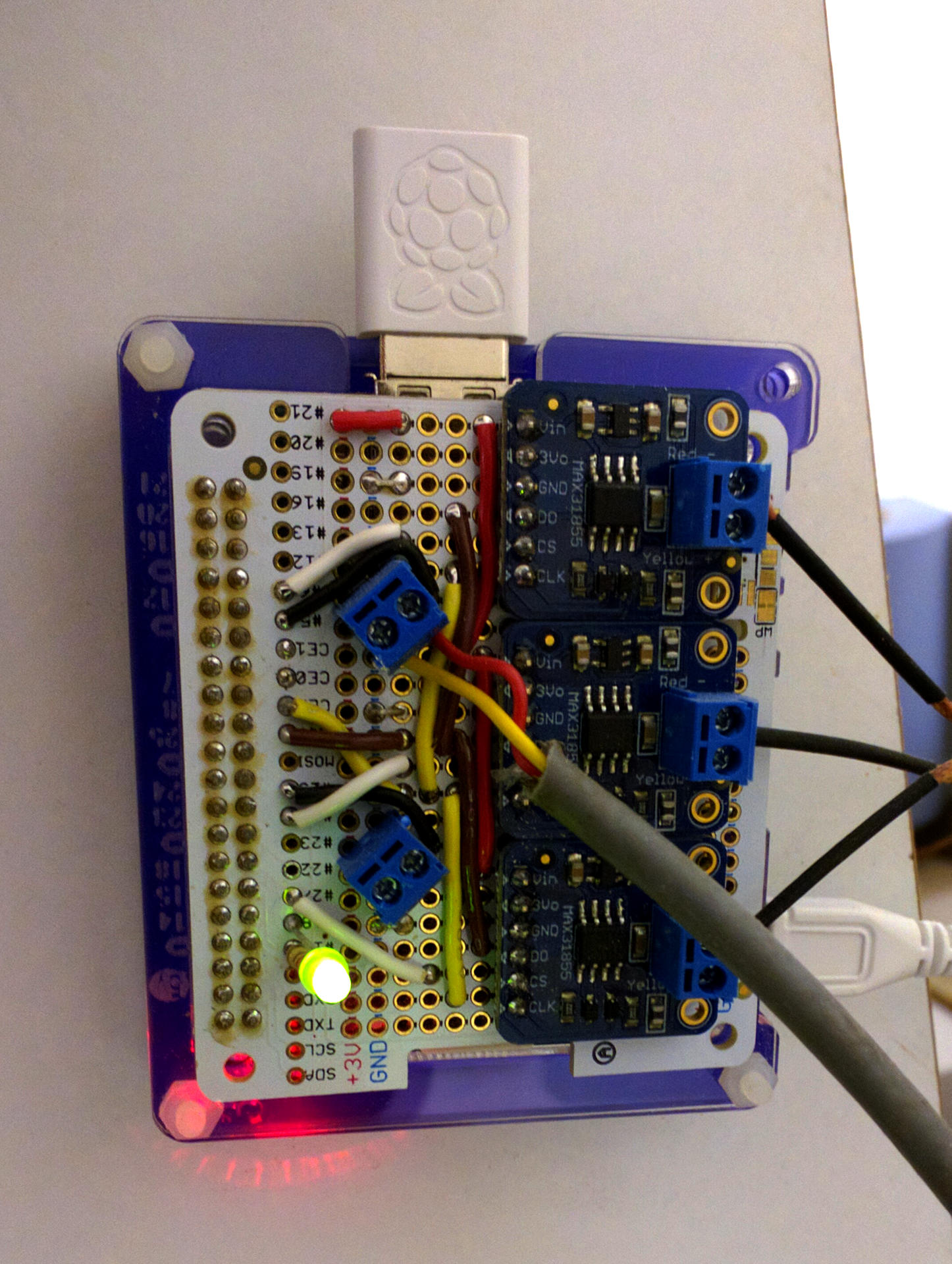 Now here’s a little problem – I wanted to use three thermocouples. Great. The MAX31855 is an SPI device. Also great. The Pi only has 2 SPI channels. Not so great. Ah well. My solution was to use 3 other ordinary GPIO pins as the CE lines to the 3 devices. This works well.