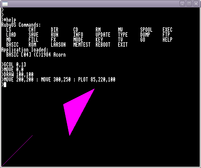 That demonstrates simple text output, then GCOL 0,13 selects colour 13 (Bright Magenta). The MOVE and DRAW commands draw the first line from 0,0 to 100,100 and the next MOVE and PLOT commands draw the filled triangle.